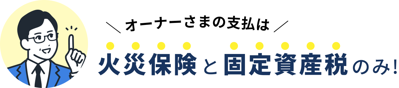 従来のサブリースは、家賃の表面利回りだけを保証するため、支出が増えると赤字になることも。 ネオリースは、オーナーの"手取り"を基準に利益を保証。負担は「固定資産税と火災保険のみ」です。